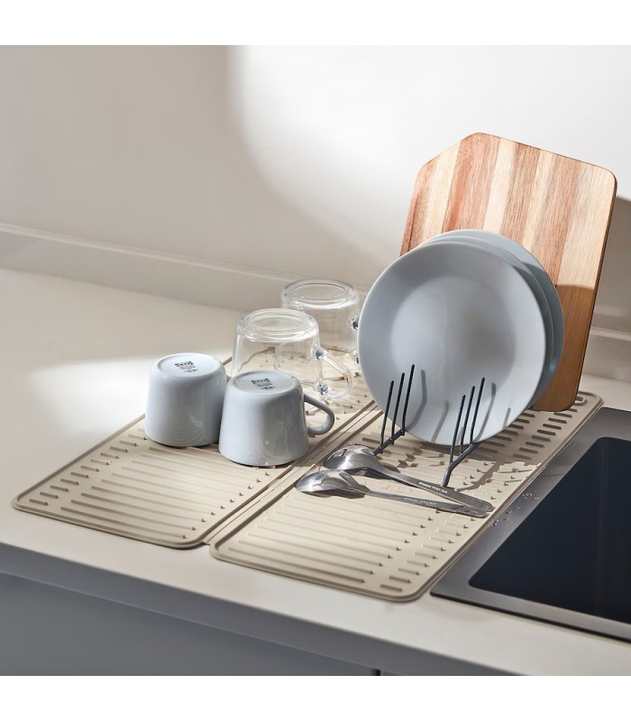 مت خشک‌کن ظرف ایکیا مدل RINNIG با طراحی کاربردی و رنگ بژ خنثی، یکی از محصولات پرطرفدار ایکیا برای آشپزخانه‌های مدرن و مینیمال است. این مت با ابعاد ۵۱ در ۴۲ سانتی‌متر، فضای مناسبی برای خشک کردن ظروف بعد از شست‌وشو فراهم می‌کند. چه در کنار سینک ظرف‌شویی، چه زیر آبچکان، این محصول باعث می‌شود سطح کابینت همیشه خشک، تمیز و مرتب بماند.